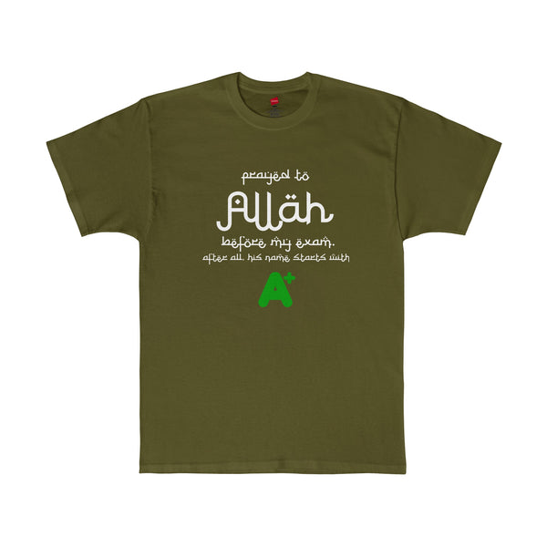 Pray to Allah Islamic Exam Humor Tee, available in a wide range of dark colours. Made for the light-hearted student!